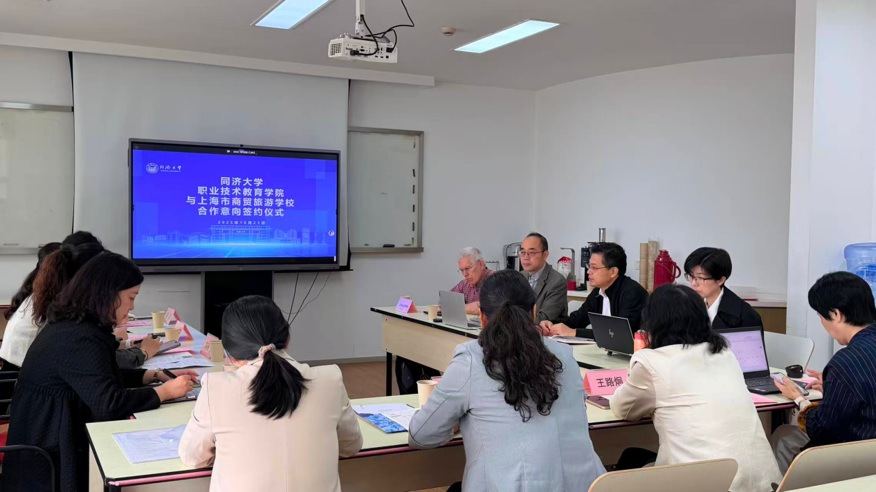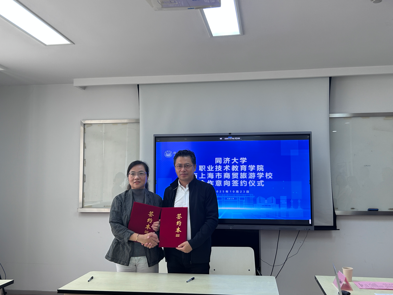 2025年10月23日上午9时,同济大学职业技术教育学院与上海市商贸旅游学校合作意向签约仪式于同济大学中德大楼成功举办。双方代表及美国俄亥俄州立大学教育学院同济大学国际引智项目专家Chris. Zirkle教授出席。