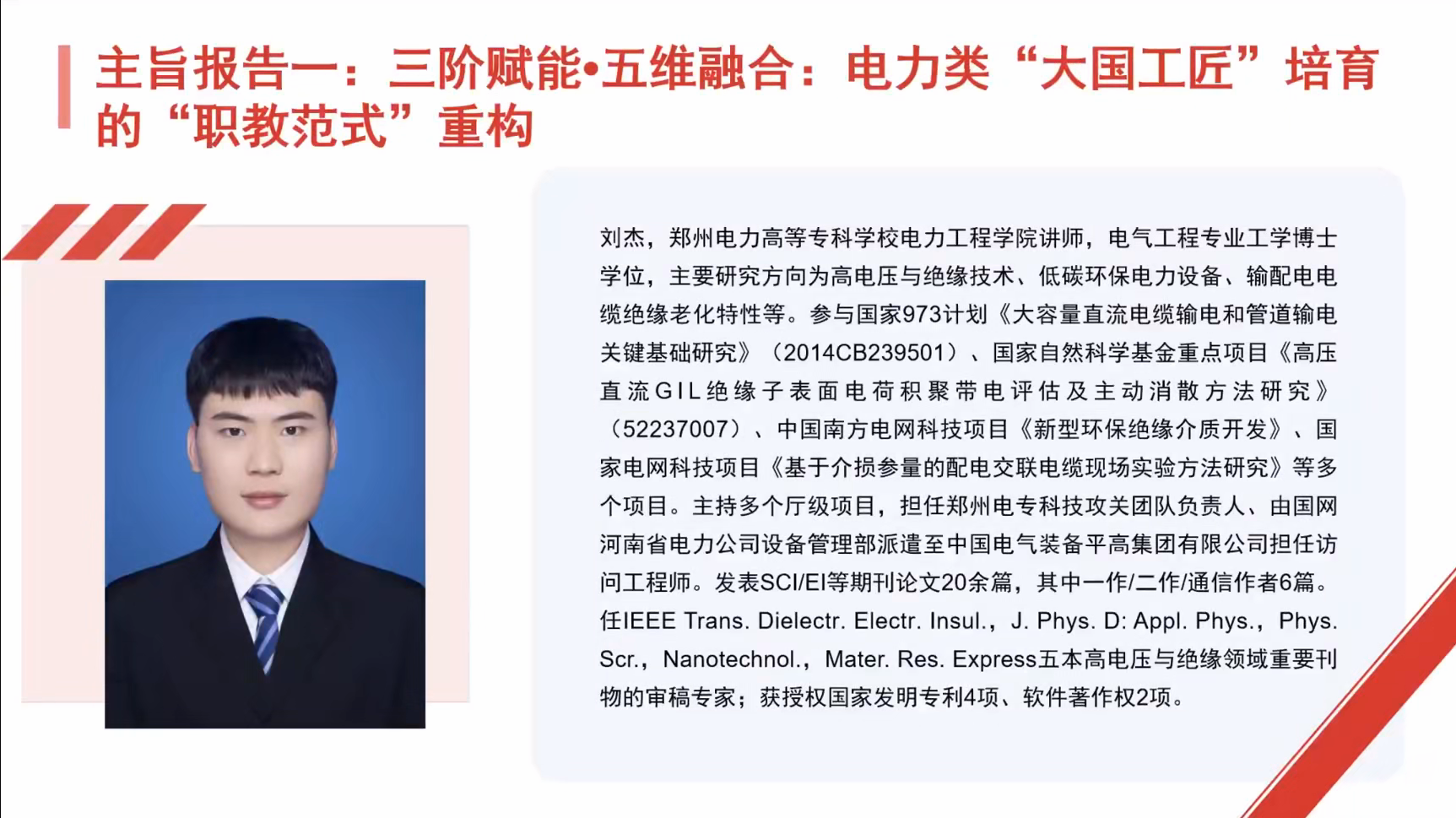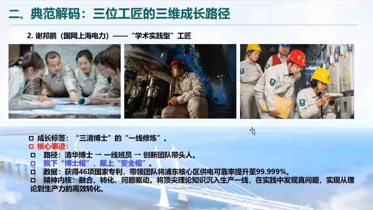 郑州电力高等专科学校刘杰博士率先带来《电力类“大国工匠”的成长密码和职教启示》报告。作为电气工程专业博士,刘博士以陶留海(中专→大专成长为特高压带电作业专家)、谢邦鹏(清华博士扎根一线获46项专利)、张黎明(硕士研究生研发200余项专利)三位电力行业大国工匠为例,提炼出“同心圆成长模型”——以“对职业的热爱、对质量的极致追求”为圆心,以“垂直深耕、产学研融合、创新引领”为中间层路径,最终实现“解决国家需求、培育人才梯队”的外层成就。基于此,他提出电力职业教育“三维育人模式”:通过“大师讲堂+工匠文化长廊”筑牢工匠之魂,通过“递进式实训+项目式学习”锻造工匠之能,通过“双师队伍+多元评价”营造工匠之场,助力学生成长为“陶留海式专才”“谢邦鹏式复合型人才”或“张黎明式创新人才”。