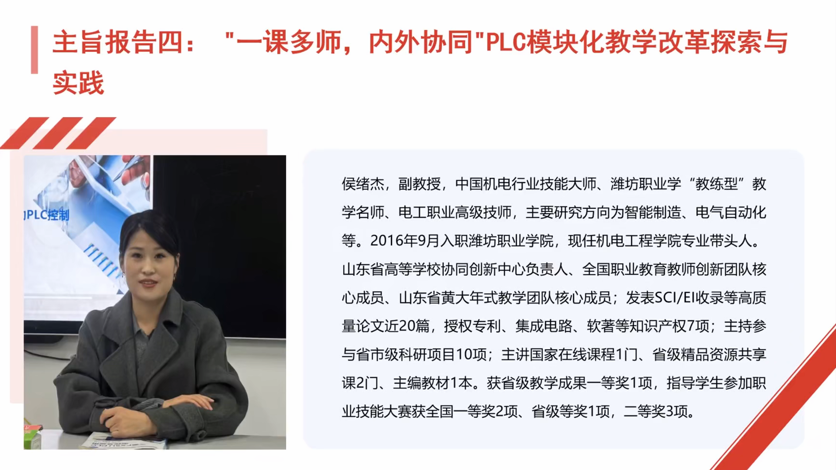 潍坊职业学院侯绪杰教授压轴分享《“一课多师,内外协同”PLC模块化教学改革探索与实践》。针对传统PLC教学“教师通讲全程、技能碎片化”问题,侯教授介绍团队创新举措:组建“3名校内教师+3名企业专家”双元教学团队,按“基础认知→核心指令→综合应用”拆分模块,由不同专长教师分工授课;重构“岗课赛证”融合的课程内容,将企业真实项目(如智能仓储控制)、大赛案例融入教学;实施“三阶六步”课堂模式(课前导析→课中探练评→课后拓),借助虚拟仿真平台实现“虚实结合”实训。改革后,学生PLC应用能力显著提升,2024级试点班学生技能竞赛获奖率较传统班级提高30%。