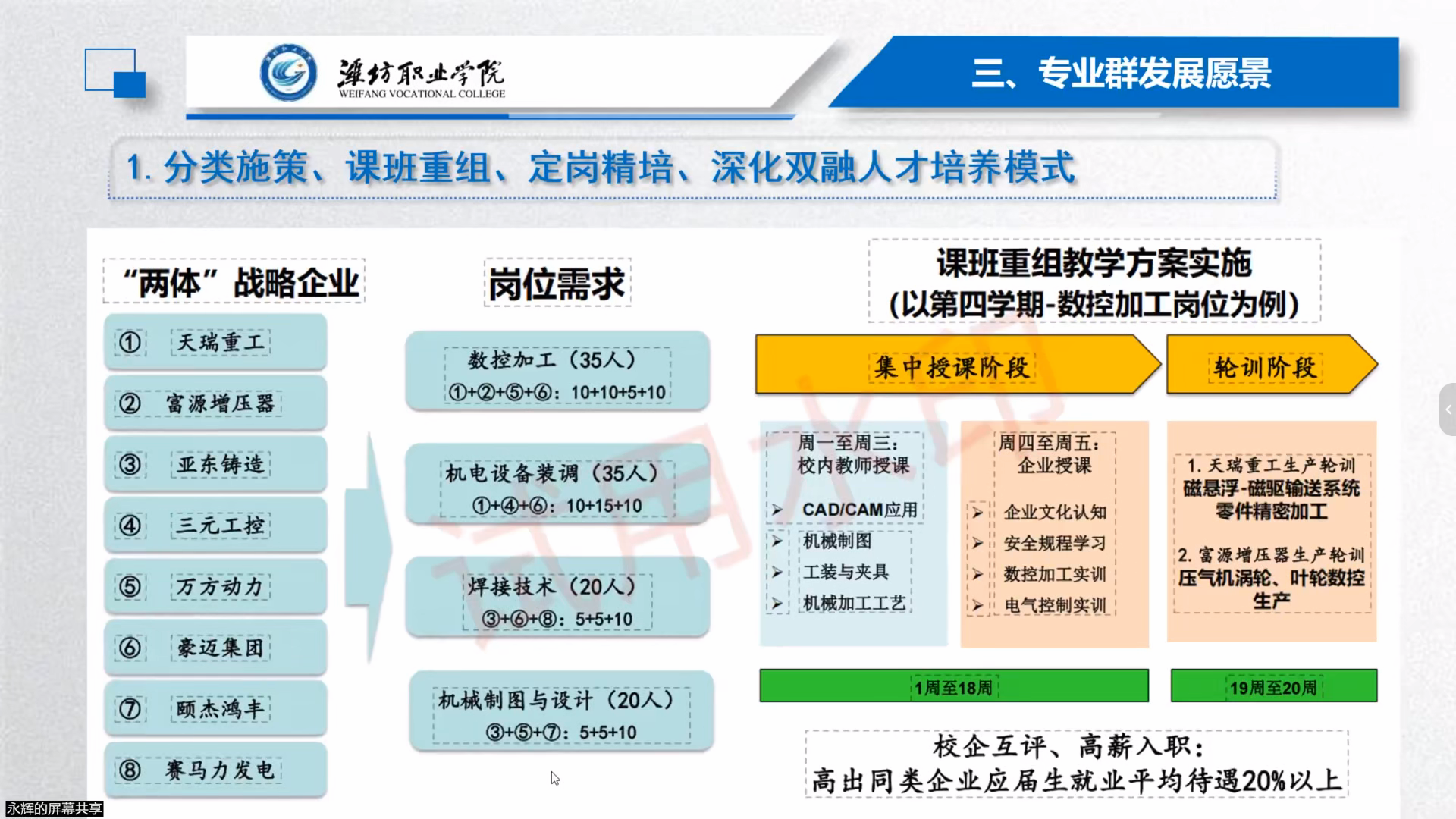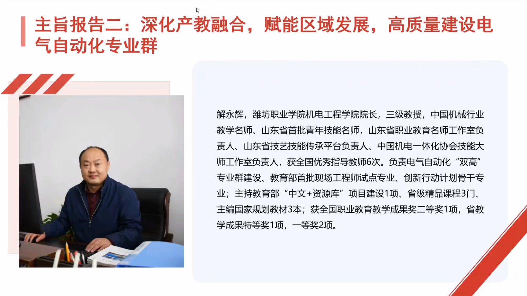 潍坊职业学院解永辉教授以《深化产教融合,赋能区域发展,高质量建设电气自动化专业群》为题,分享“双高”专业群建设经验。解教授介绍,该校电气自动化专业群聚焦区域智能制造需求,构建“双赛驱动、项目赋能”人才培养体系——以职业技能大赛提升技术能力,以创新创业大赛培育创新思维,近十年获国赛一等奖24项、“互联网+”竞赛五金八银。在产教融合方面,与歌尔股份、天瑞重工共建生产性实训基地,年均完成零件加工500万件以上;开发13套虚拟仿真实训系统,解决高危实操难题。同时,专业群积极推进国际化办学,与俄罗斯伏尔加格勒国立大学开展“3+1”联合培养,向加纳、乌干达等国输出课程标准7套,打造“工匠人才培养+产教融合示范+国际职教输出”三位一体的专业群发展格局。