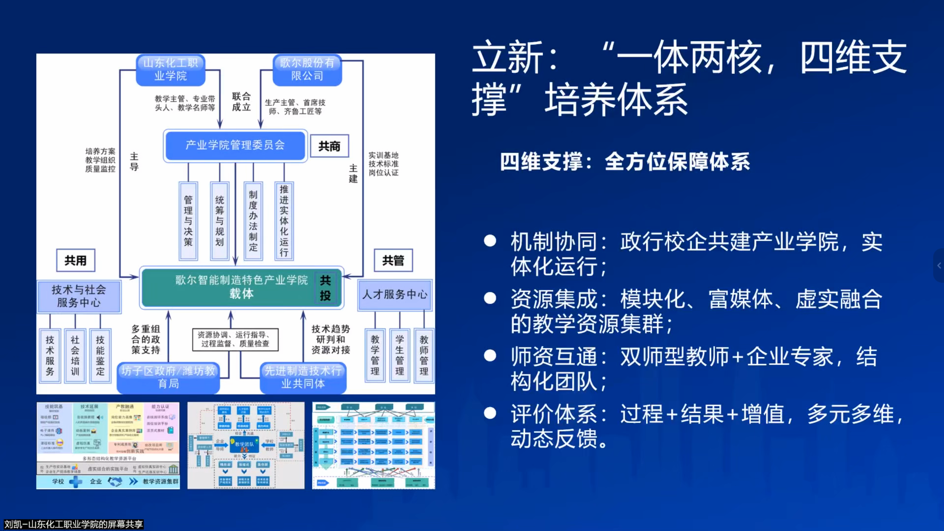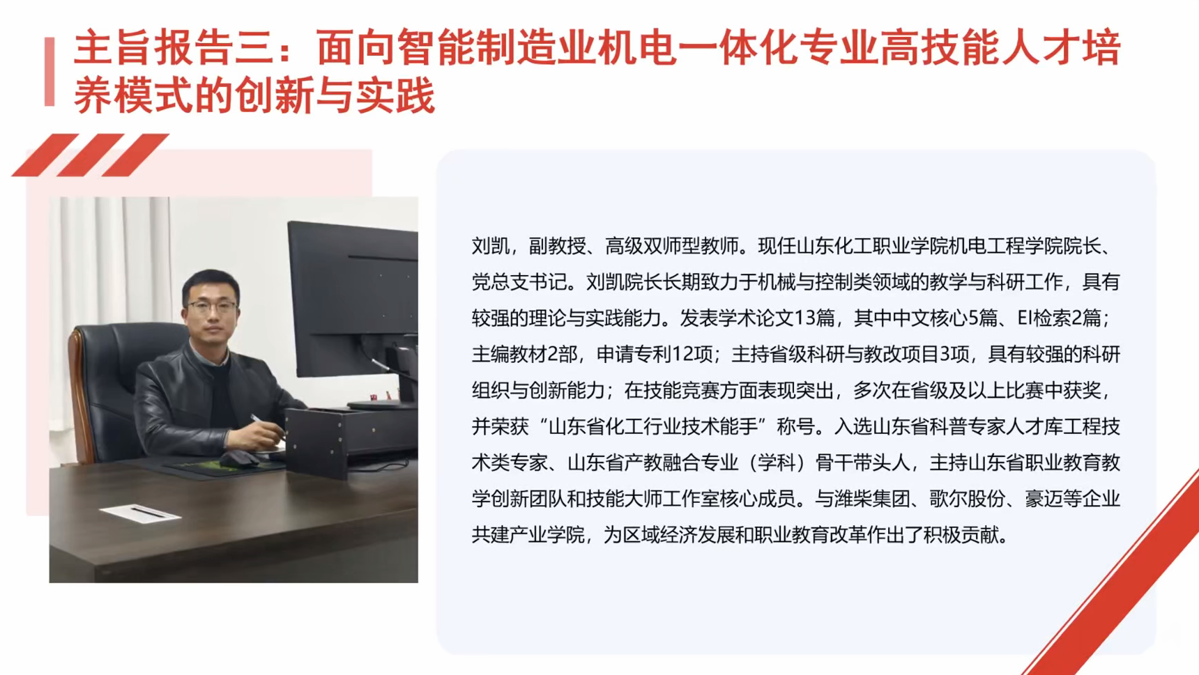 山东化工职业学院刘凯院长带来《面向智能制造业机电一体化专业高技能人才培养模式的创新与实践》报告。针对智能制造产业升级与人才供给失准的矛盾,刘院长介绍该校构建的“一体两核、四维支撑”培养体系:以“职业品德+技术知识+专业技能+身心健康+技艺审美创新”五维人才画像为“一体”定标;以“模块化课程重构”“双线交替小学期模式”为“两核”驱动——将三年培养拆分为18个小学期,实现“理论学习+虚拟仿真+企业实践”高频轮换;以“机制协同、资源集成、师资互通、评价多元”为“四维”保障。该模式成效显著,毕业生对口就业率提升15%,相关经验被《中国教育报》头版报道,获省部级技能大赛奖项150余项。